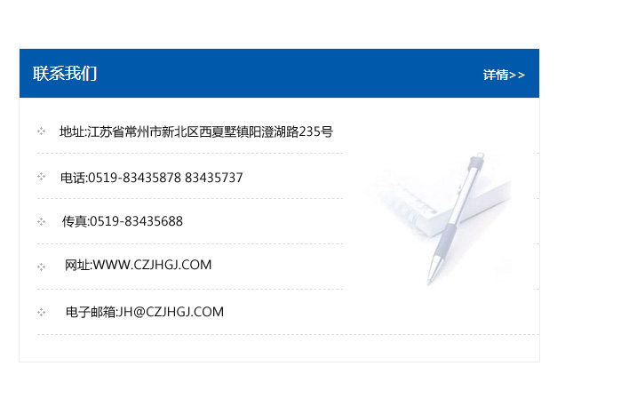傳真:0519-83435688    郵編:213135    網址:WWW.czjhgj_com.cqlej.com    電子郵箱:JH@czjhgj_com.cqlej.com
